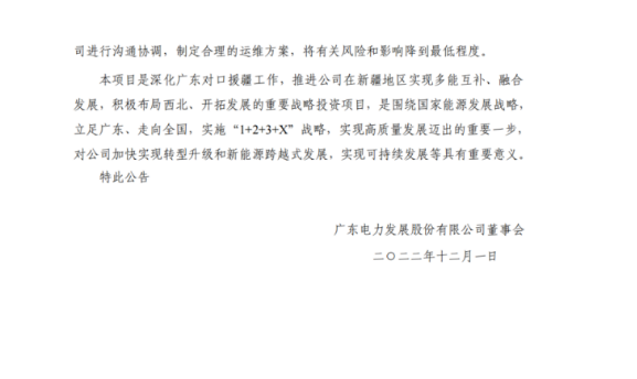 廣東電力表示,本項(xiàng)目是深化廣東對口援疆工作,推進(jìn)公司在新疆地區(qū)實(shí)現(xiàn)多能互補(bǔ)、融合發(fā)展,積極布局西北、開拓發(fā)展的重要戰(zhàn)略投資項(xiàng)目,是圍繞國家能源發(fā)展戰(zhàn)略,立足廣東、走向全國,實(shí)施“1+2+3+X”戰(zhàn)略,實(shí)現(xiàn)高質(zhì)量發(fā)展邁出的重要一步,對公司加快實(shí)現(xiàn)轉(zhuǎn)型升級和新能源跨越式發(fā)展,實(shí)現(xiàn)可持續(xù)發(fā)展等具有重要意義。