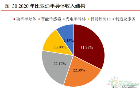 2020 年比亞迪半導體實現收入 14.41 億元,同比增長 31.46%。其中,功率半導體、 智能傳感器、光電半導體、智能控制 IC、制造及服務分別實現收入 4.61 億元、3.23 億 元、3.20 億元、1.87 億元以及 1.32 億元,占比分別為 31.99%、22.39%、22.17%、13.00% 以及 9.15%。