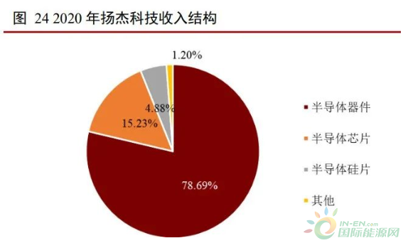 2020 年士蘭微營業收入 42.81 億元,同比增長 37.61%。其中,分立器件、集成電 路、發光二極管收入分別為 22.03 億元、14.20 億元以及 3.91 億元,分別占總收入的 51.47%、33.17%以及9.13%。分立器件中,IGBT產品營收 2.6 億元,占收入比重為6.07%。