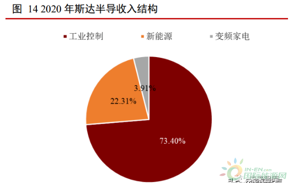 斯達半導是國內 IGBT 龍頭,市占率全球第七。根據 IHS 報告,2019 年,斯達半 導 IGBT 模塊市占率全球第七,是唯一進入前十的中國企業。斯達半導成立于 2005 年 4 月,2020 年 2 月在上交所主板上市。公司主要產品為 IGBT 模塊,主要用于工業控制、新能源和變頻家電領域。2020 年工控、新能源和變頻家電收入占比分別為 71.68%、26.14%和 1.59%。2020 年公司實 現收入 9.63 億元,同比+23.55%,凈利潤 1.81 億元,同比+33.30%。2020 年公司毛利率 為 31.56%,凈利率為 18.80%。