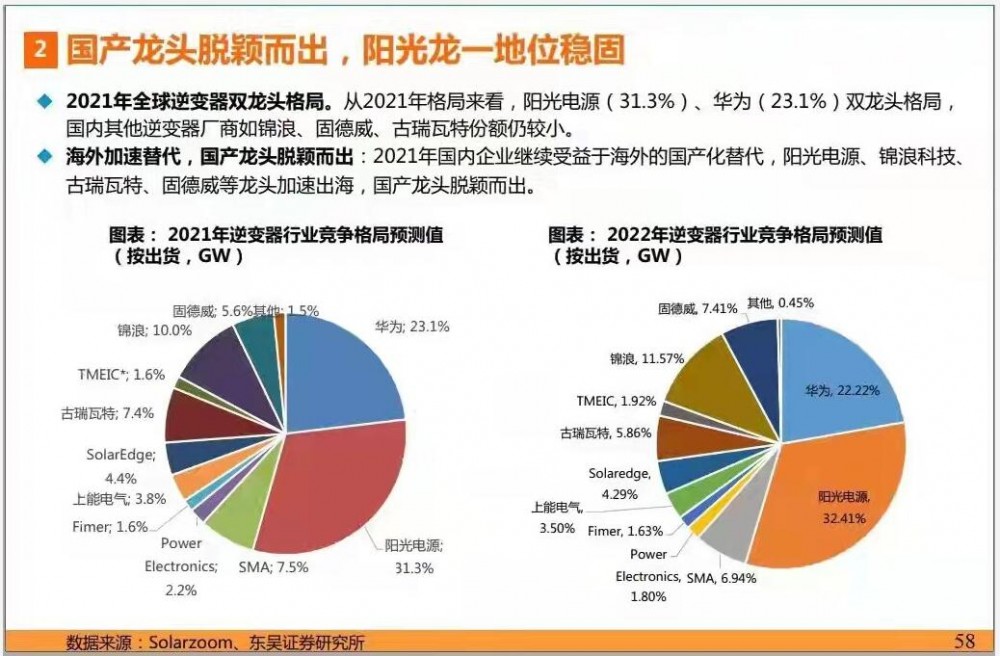 經過多年大浪淘沙式的行業洗牌后,馬太效應凸顯,2021年全球逆變器呈現雙龍頭格局。從2021年格局來看,陽光電源占據31.3%的市場,而華為占據23.1%。
