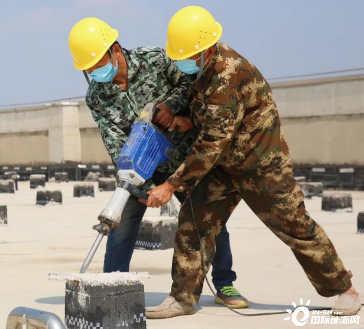 ▲ 在華能屋頂光伏發電項目施工現場,工人對光伏組件混凝土基礎設施進行施工。