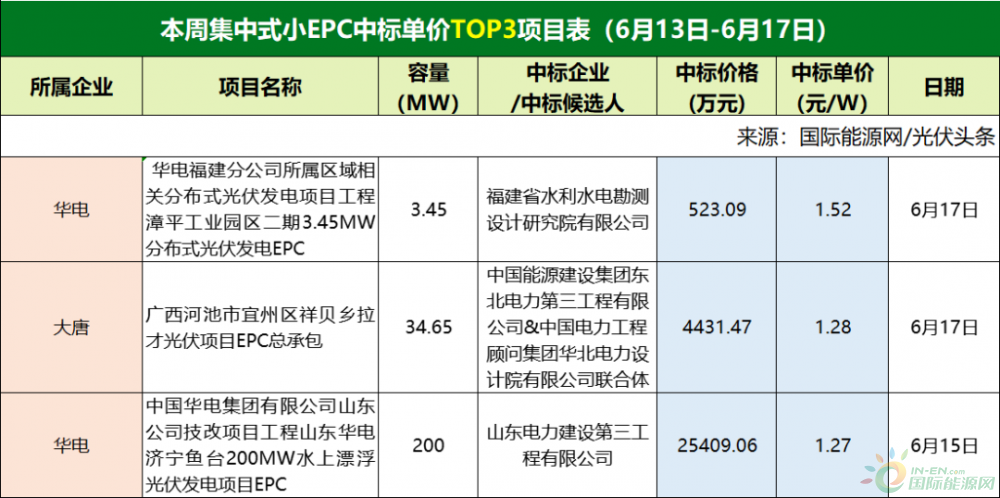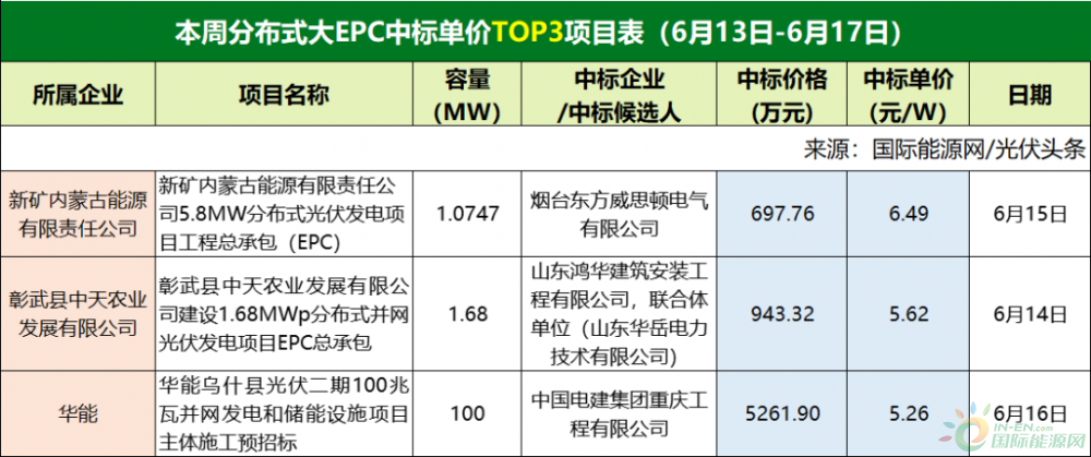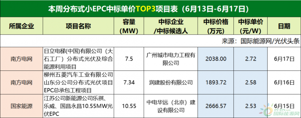國際能源網/光伏頭條(PV-2005)對6月第3周(6月13日-6月17日)光伏EPC招/中標項目不完全統計,本周招標規模合計3556.14MW,中標規模3017.34MW,招中標規模合計6573.48MW。此外,本周多晶硅、電池片紛紛上漲,組件龍頭企業加速產業鏈垂直一體化,同樣值得關注!