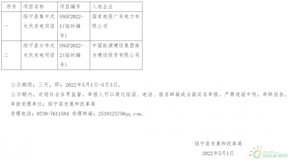 公示顯示,國家電投廣東電力有限公司入選綏寧縣集中式光伏發(fā)電項目,中國能源建設(shè)集團南方建設(shè)投資有限公司入選綏寧縣分布式光伏發(fā)電項目。