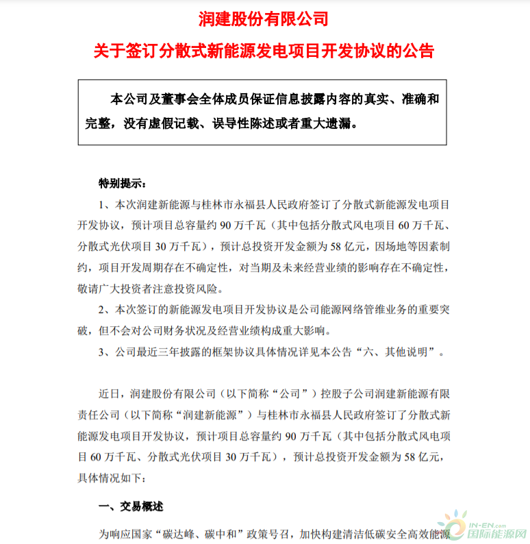 協議顯示,為響應國家“碳達峰、碳中和”政策號召,加快構建清潔低碳安全高效能源體系,潤建新能源擬與永福縣人民政府在分散式光伏、分散式風電等領域進行戰略合作,通過整合利用永福縣閑散的水塘、洼地、灘涂、荒山荒地、工業園區等閑置土地,以及土地性質滿足風光新能源建設要求的一般農用地、林地資源,實施整縣分散式光伏發電、分散式風力發電項目。預計項目總容量約90萬千瓦(其中包括分散式風電項目60萬千瓦、分散式光伏項目30萬千瓦),預計風電投資金額46億元,光伏投資金額12億元總投資開發金額為58億元。