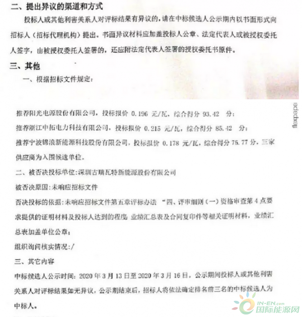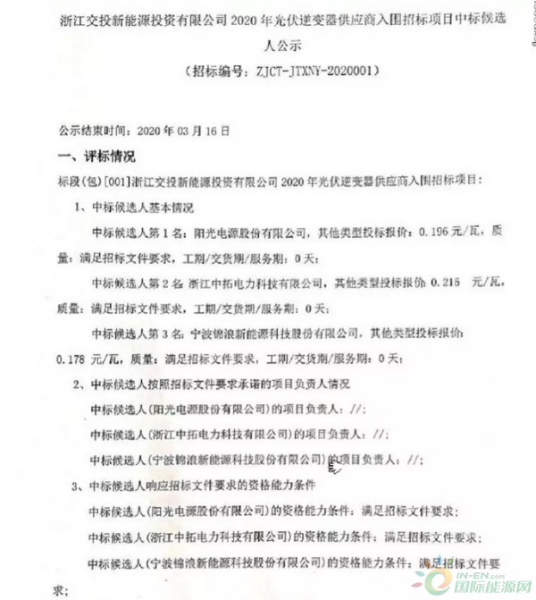 陽光電源股份有限公司以0.196元/瓦的報價,位列第一中標候選人;浙江中拓電力科技有限公司以0.215元/瓦的報價,位列第二中標候選人;寧波錦浪新能源科技股份有限公司以0.178元/瓦的報價位列第三中標候選人。
