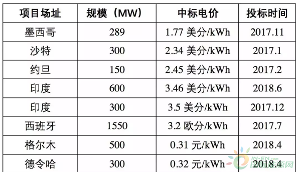 全球典型1500V光伏項目及中標電價