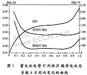 蓄電池的電勢(shì)E、內(nèi)阻Ri與電池的荷電狀態(tài)有關(guān)。荷電以系數(shù)k表示,其值在0~1之間,0代表未荷電,1代表滿荷電。隨荷電系數(shù)k由0上升,蓄電池電勢(shì)非線性地增大,內(nèi)阻Ri則呈現(xiàn)先下降最后又略有升高的形狀,如圖1所示。由圖1可見,蓄電池內(nèi)阻Ri的充、放電曲線亦有差別。起動(dòng)機(jī)每起動(dòng)一次,荷電狀態(tài)系數(shù)k均會(huì)下降百分之幾,變化量很小;而蓄電池電勢(shì)E(k)的變化則視k之值而異。當(dāng)k在0.3~0.85范圍內(nèi)時(shí),起動(dòng)機(jī)每起動(dòng)一次E(k) 變化很小,接近恒值,但當(dāng)k>0.85和k<0.3時(shí),隨k值的小變化,E(k)變化較為明顯。在設(shè)計(jì)蓄電池模擬電源控制軟件時(shí)應(yīng)予以考慮。